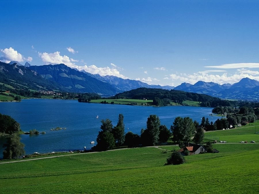 Switzerland Wall Mural takes your breath away with majestic mountains overlooking a peaceful blue lake, called Lac de la Gruyere, and green grass. This landscape wallpaper is created from a photo of the Swiss countryside thatâs printed on removable wallpaper. If feels like youâre looking out of a chalet window at the beautiful nature scene. Youâll want to put on hiking boots to stroll the rolling, green countryside. Itâs: