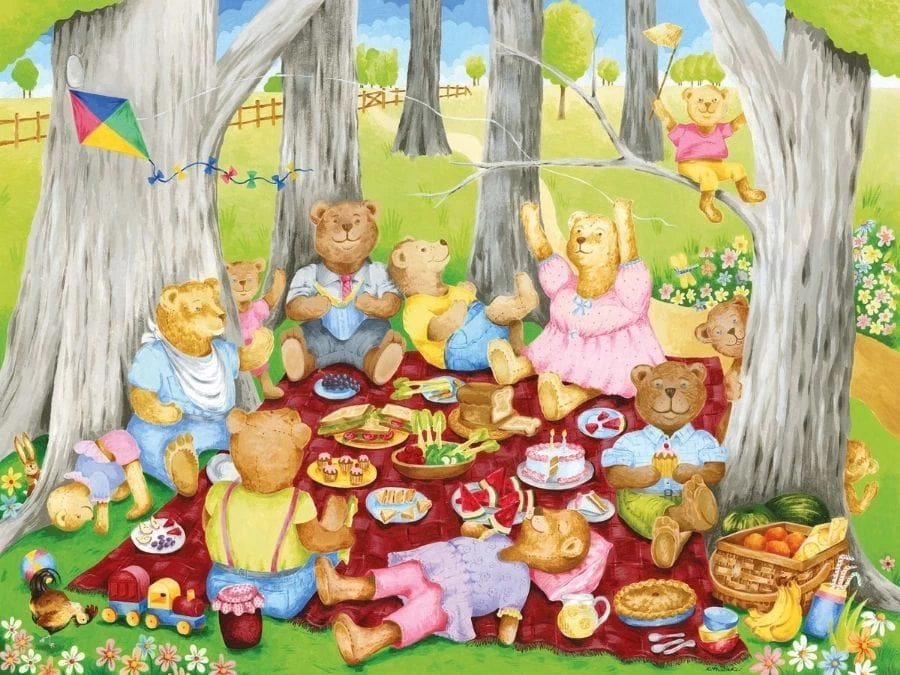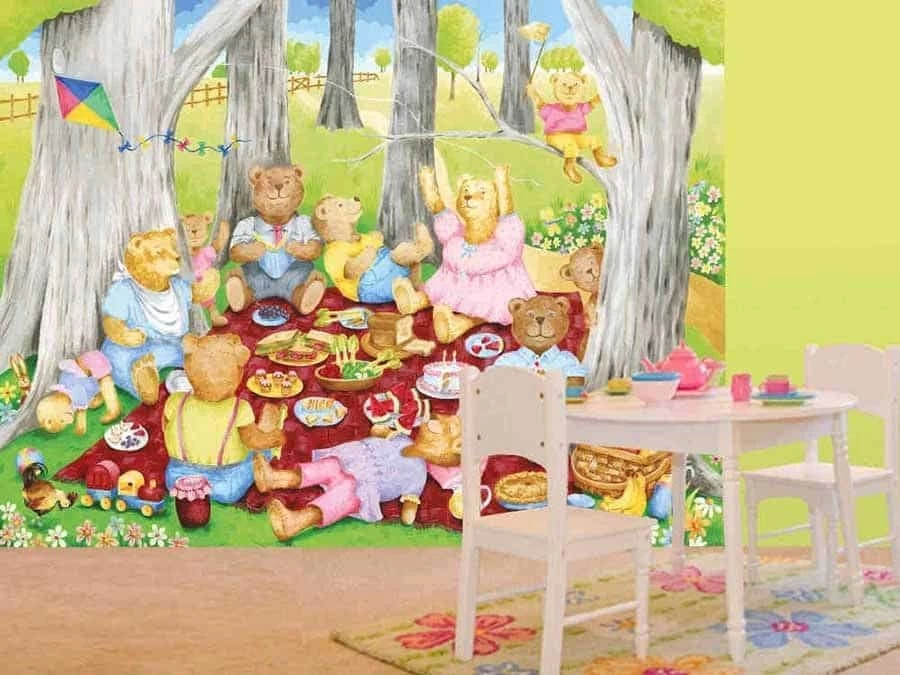 Teddy Bear Picnic Wallpaper gets you humming along to the famous song! Children enjoy hours of imaginative play under this teddy bear wallpaper, setting up their own tea party with marvelous sandwiches, cake, cupcakes, pie, fruit and lemonade. They can imagine joining in the games, flying a kite, climbing a tree and playing with toys. The picnic mural looks like it’s painted right on your wall. Why? It’s an original painting of cute bears in the forest that’s scanned at high resolution, capturing every brush stroke and dab of paint. Then it’s printed onto removable wallpaper. It’s: