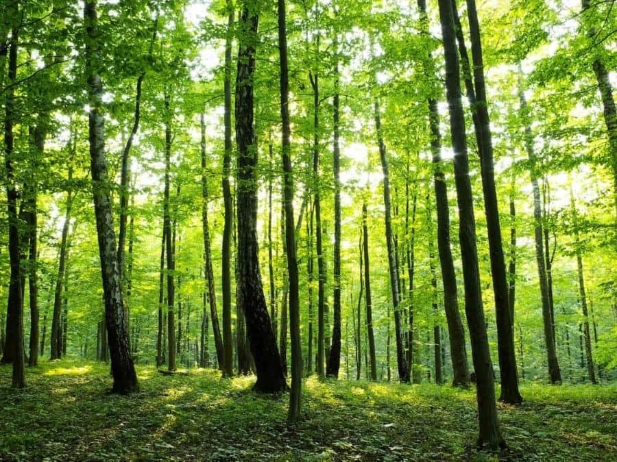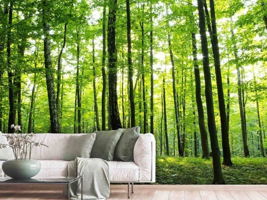 Tranquil Forest Wallpaper adds a peaceful feeling to walls with its green trees in a sunny forest. Created from a photo, it captures all the texture from the leaves and foliage in the woods. This wall mural adds depth to a room, making you feel like you can step into the landscape and stroll through nature. It’s: