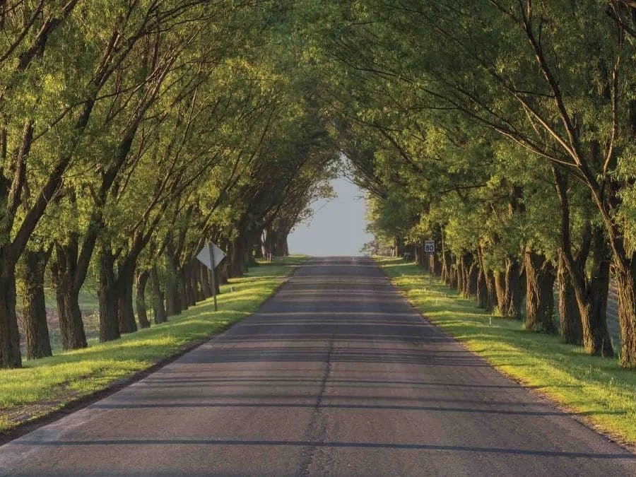 Tree Tunnel Wallpaper creates a beautiful feeling on walls with a path of trees bordering a country road. Created from a high resolution photo by a Canadian photographer, it captures the sun setting over farm fields, casting shadows onto the street from behind the arch of trees. Youâll want to step into the mural and take a leisurely drive. Itâs: