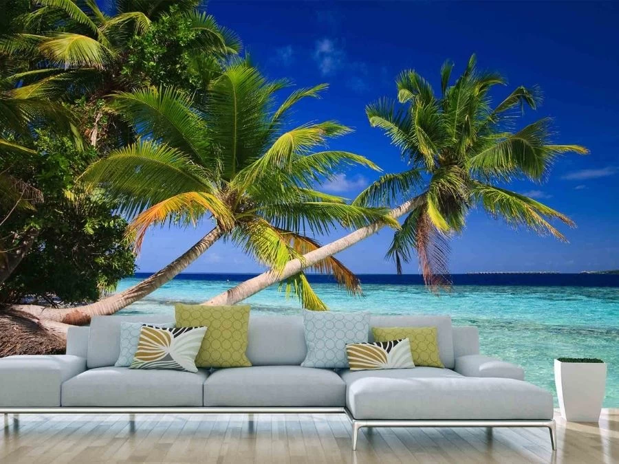 Tropical Beach Wallpaper creates beautiful walls with its palm trees in the Maldives. Created from a photo, it captures the coconut trees hanging over a tranquil turquoise ocean. There’s barely a cloud in the brilliant blue sky, making this tropical island feel like paradise. It’s: