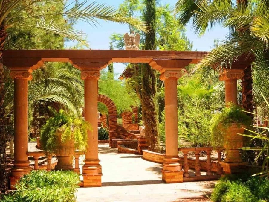 Tropical Garden Wallpaper adds a sunny feeling to walls with its view of botanical landscaping through columns. Created from a photo, it captures palm trees, plants in terracotta urns, shrubs and a brick arch off of a terrace. It feels like you’re at a resort in the Caribbean. This wall mural is: