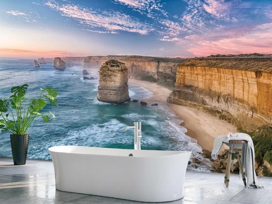Twelves Apostles Wallpaper is gorgeous with its view of The Twelve Apostles, Great Ocean Road, Victoria, Australia. Created from a photo, it captures the limestone stacks at sunset against a blue and pink sky. The sea crashes on the sand beach and rocks, just below the rugged cliffs creating a beautiful landscape for walls. The 12 Apostles wallpaper is: