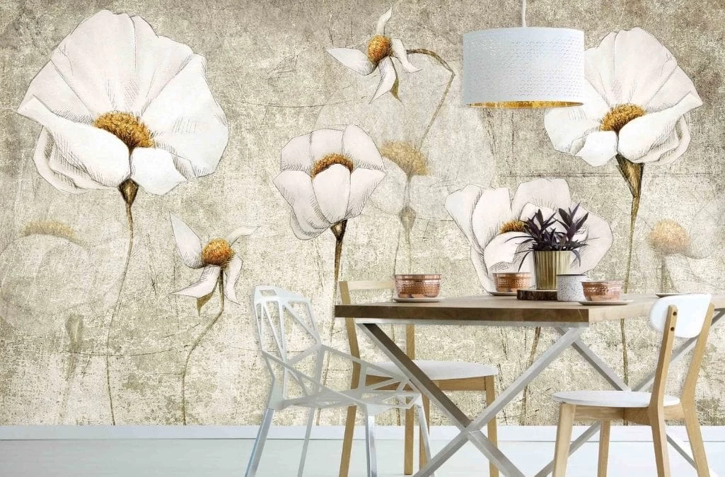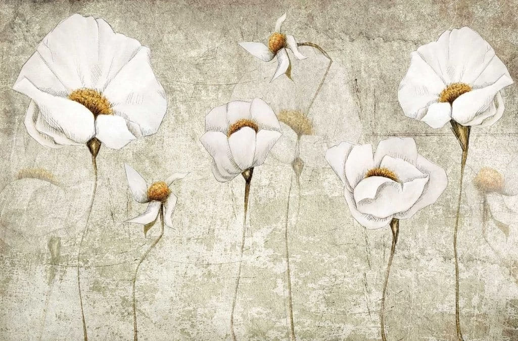 White Poppy Wallpaper creates elegant walls with its delicate white flowers. Created from a computer illustration, the white poppies look like they’re sketched in ink and the centre of the flower is coloured in yellow. The background of the poppy wallpaper is beige, aged and almost creates a vintage look. It’s: