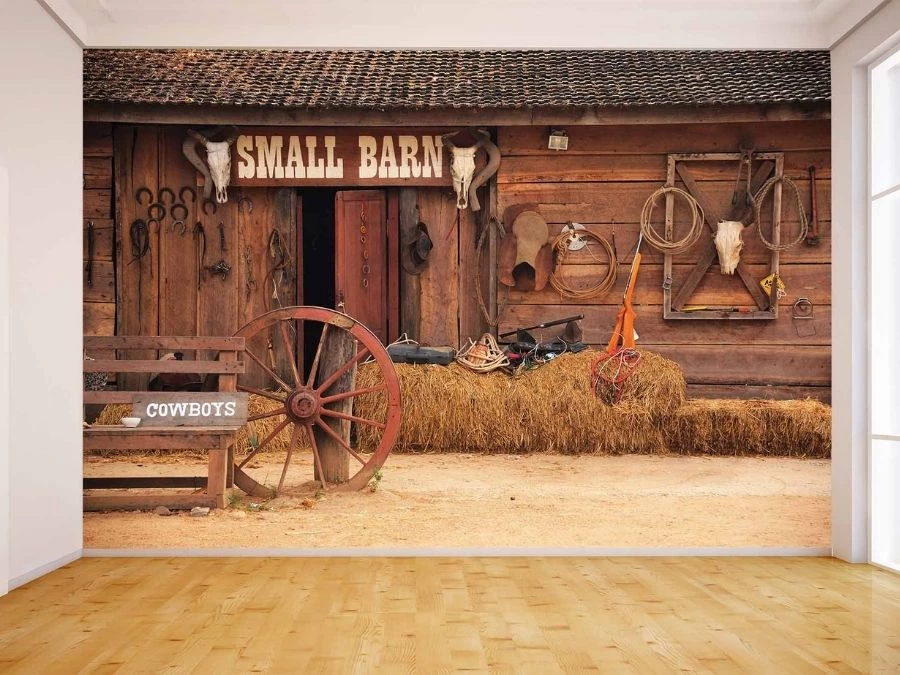 Wild West Wallpaper adds an old western feeling to walls with its view of a wooden barn in the dusty desert. Created from a photo, it captures details like a wagon wheel, door, horse saddle, cowboy hat, horseshoes, lasso, gun, tools, bull skull, bales of hay and signs saying “cowboys” and “small barn.” This wall mural is: